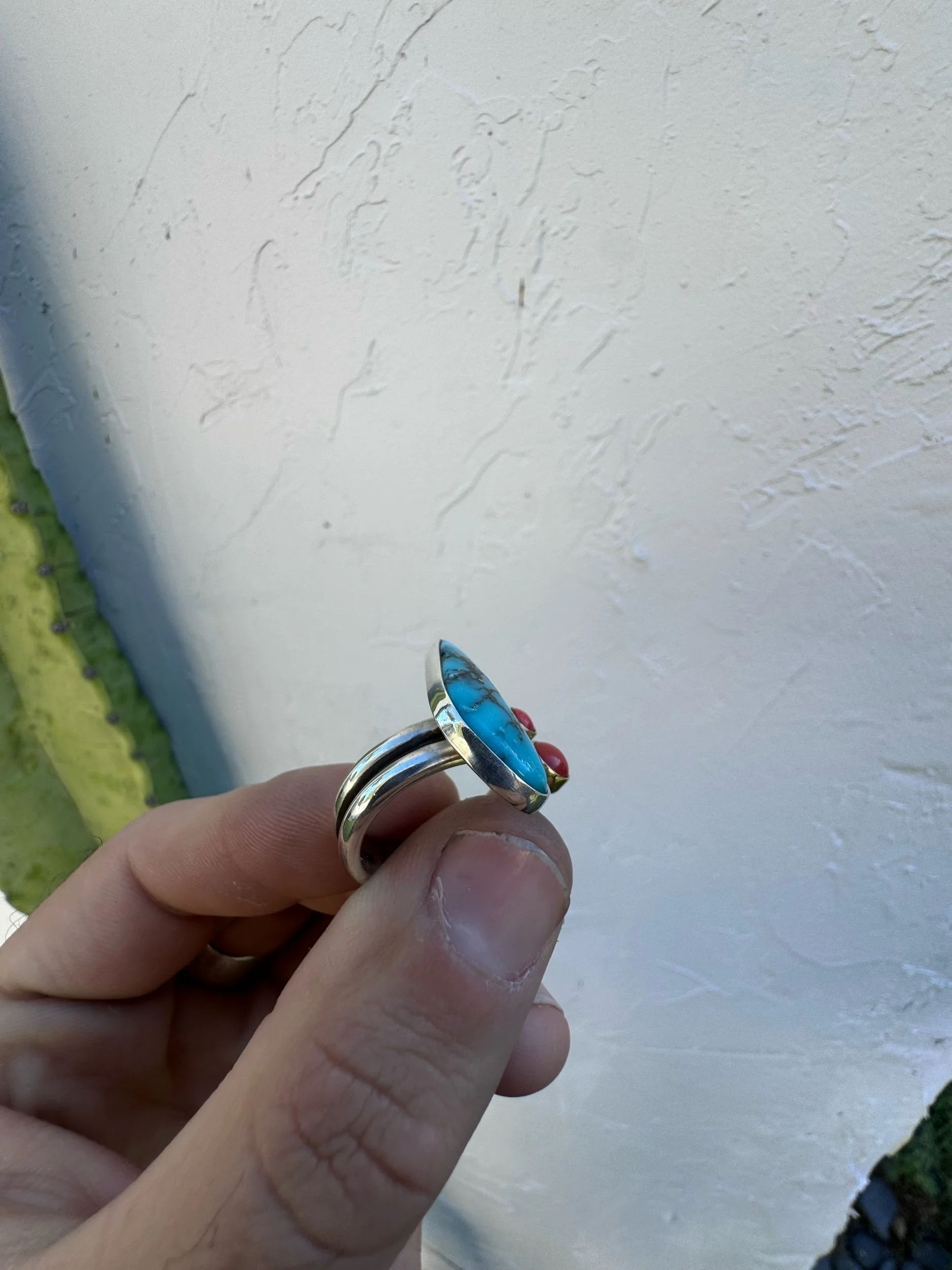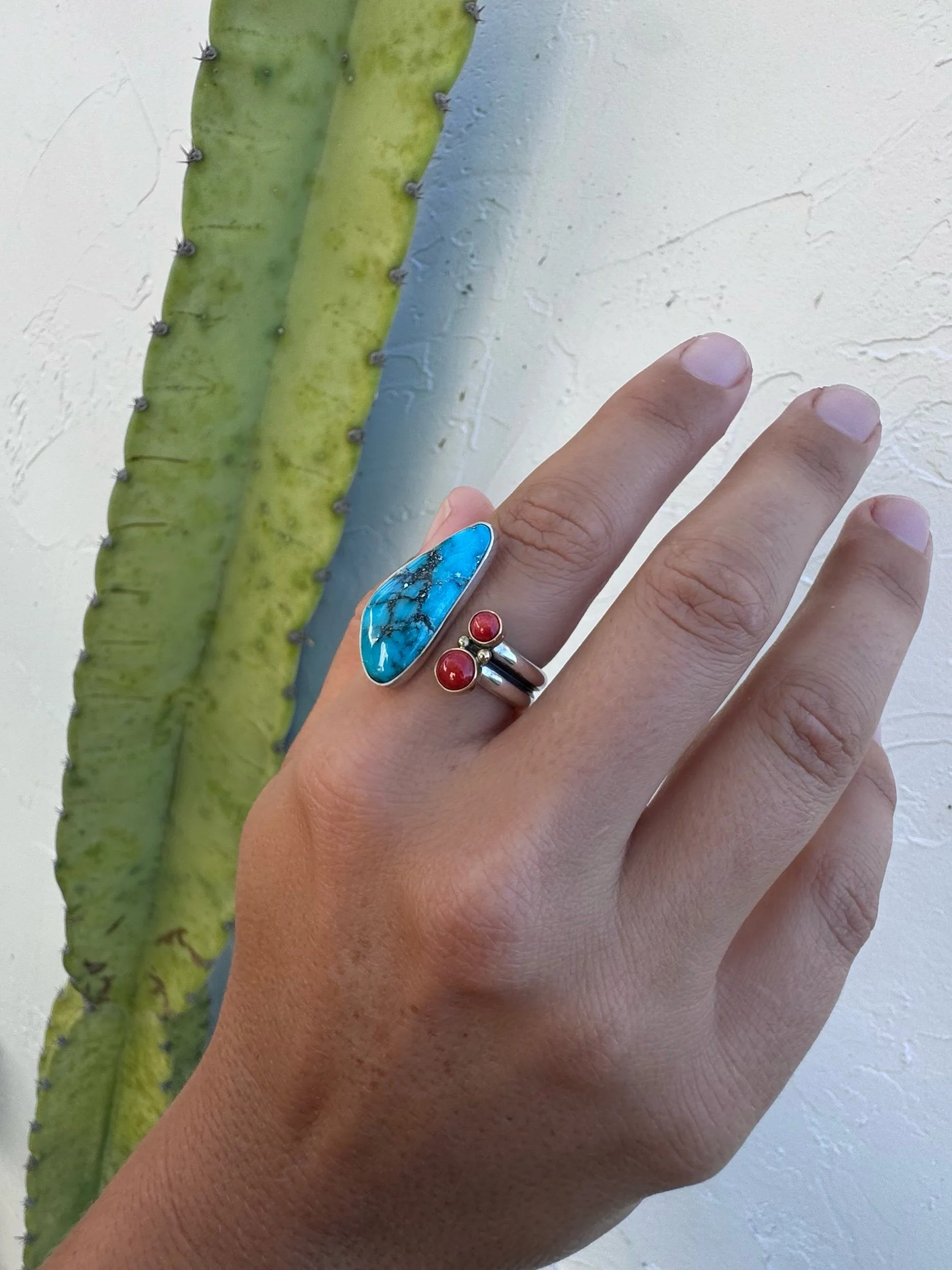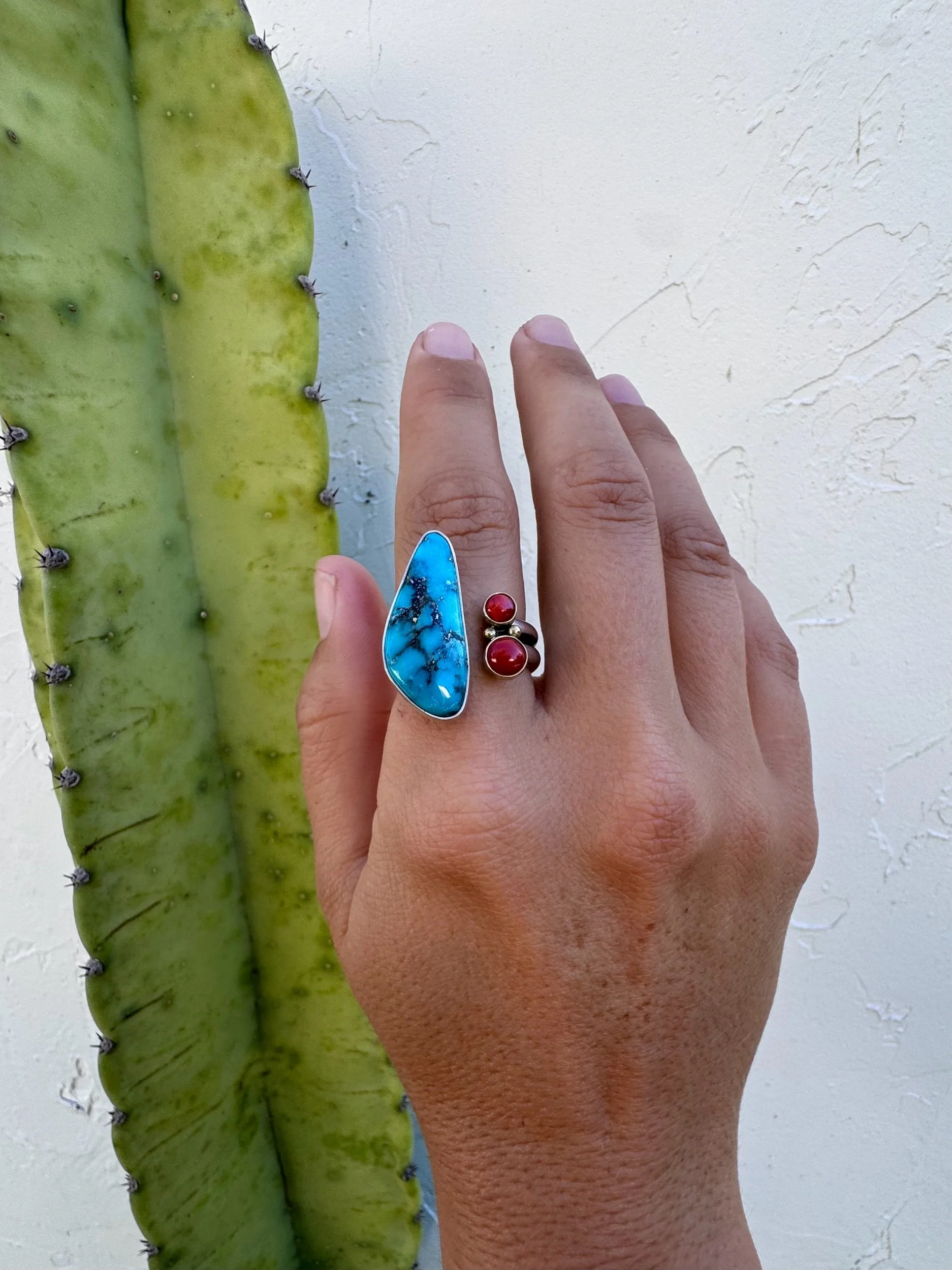 This one-of-a-kind ring pairs vivid Kingman turquoise with fiery Mediterranean coral — two stones that embody balance between sky and earth, calm and passion. Set in an 18k gold bezel and sterling silver base, the contrast of cool blue and deep red creates a striking, soulful statement.